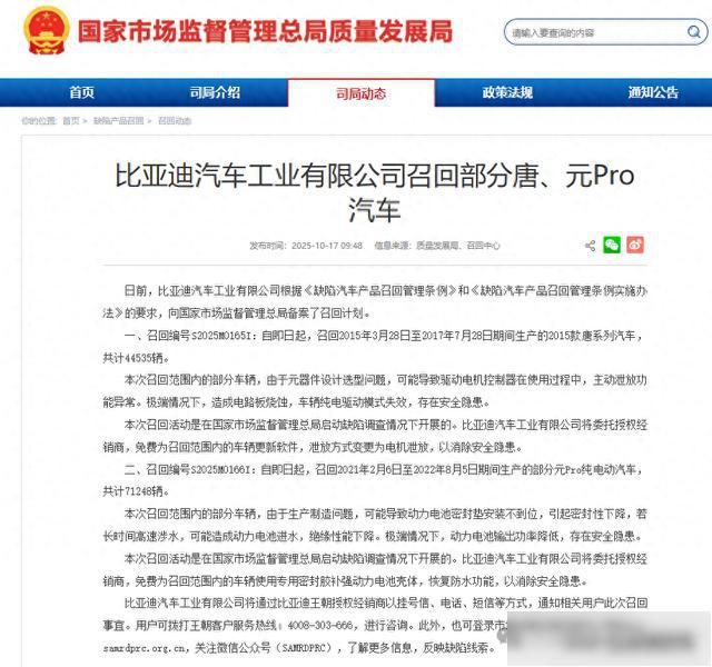 一、召回编号S2025M0165I:自即日起,召回2015年3月28日至2017年7月28日期间生产的2015款唐系列汽车,共计44535辆。